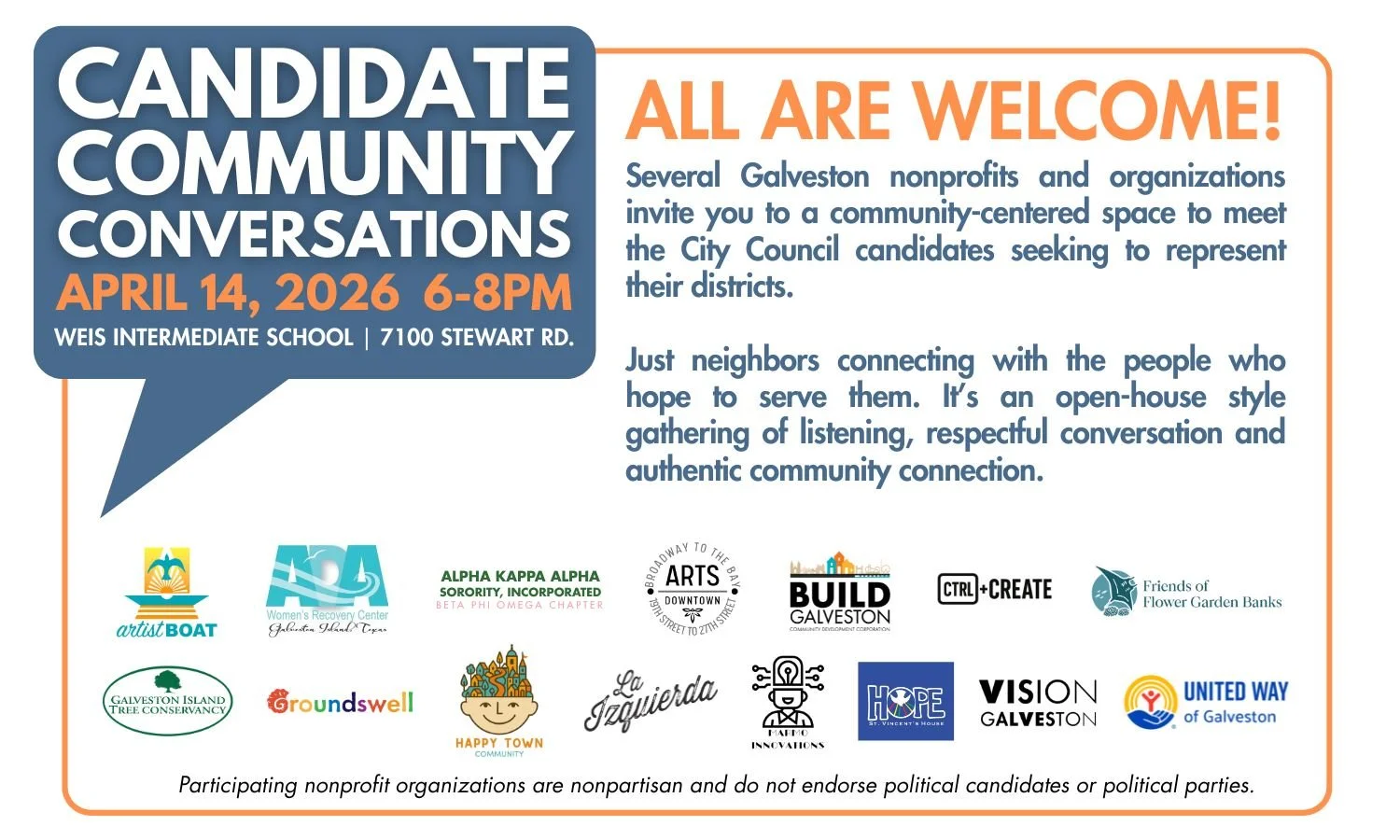 This meeting focused on engagement events for Galveston residents to interact with district and mayoral candidates of the City of Galveston and the development of meaningful policy questions for them.